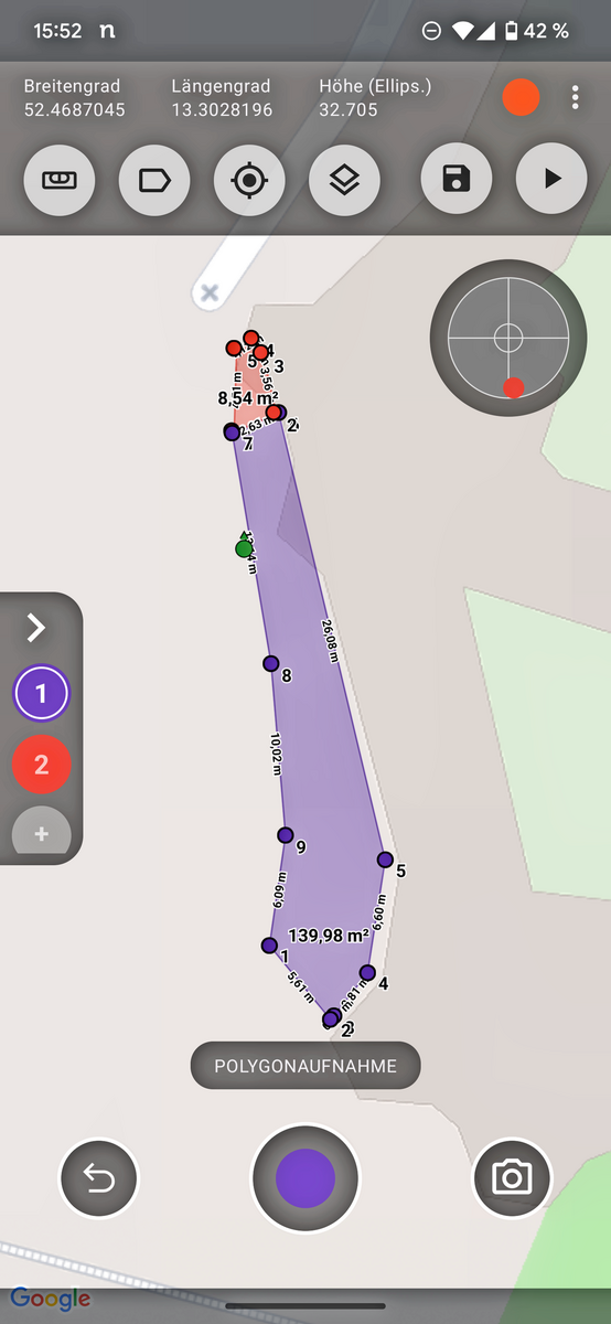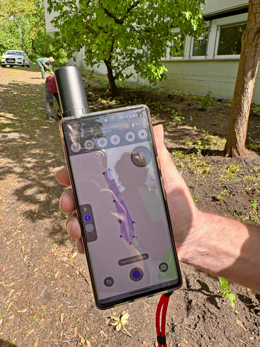1Die Berliner nutzen Mikko/3tag zum schnellen und digitalen Aufmaß (±2?cm Genauigkeit) – GNSS, Cloud, Basiskarten und Bauteilkataloge inklusive. So wurden für die Flächenerfassung eines neu zu bepflanzenden Bereichs die Eckpunkte mit der Mikko-App und der GNSS-Antenne am Smartphone (Hardware-Komponente) eingemessen – Punkt für Punkt. Eine manuelle Schließung der Fläche war nicht erforderlich: Das System schließt automatisch die Fläche, durch Verknüpfung von Start- und Endpunkt. Selbst eine schwierige Stelle, bei der ein Teil der Fläche direkt an ein Gebäude grenzte, konnte erfolgreich erfasst werden. So spart das Team wertvolle Zeit – ohne Kompromisse bei der Genauigkeit.