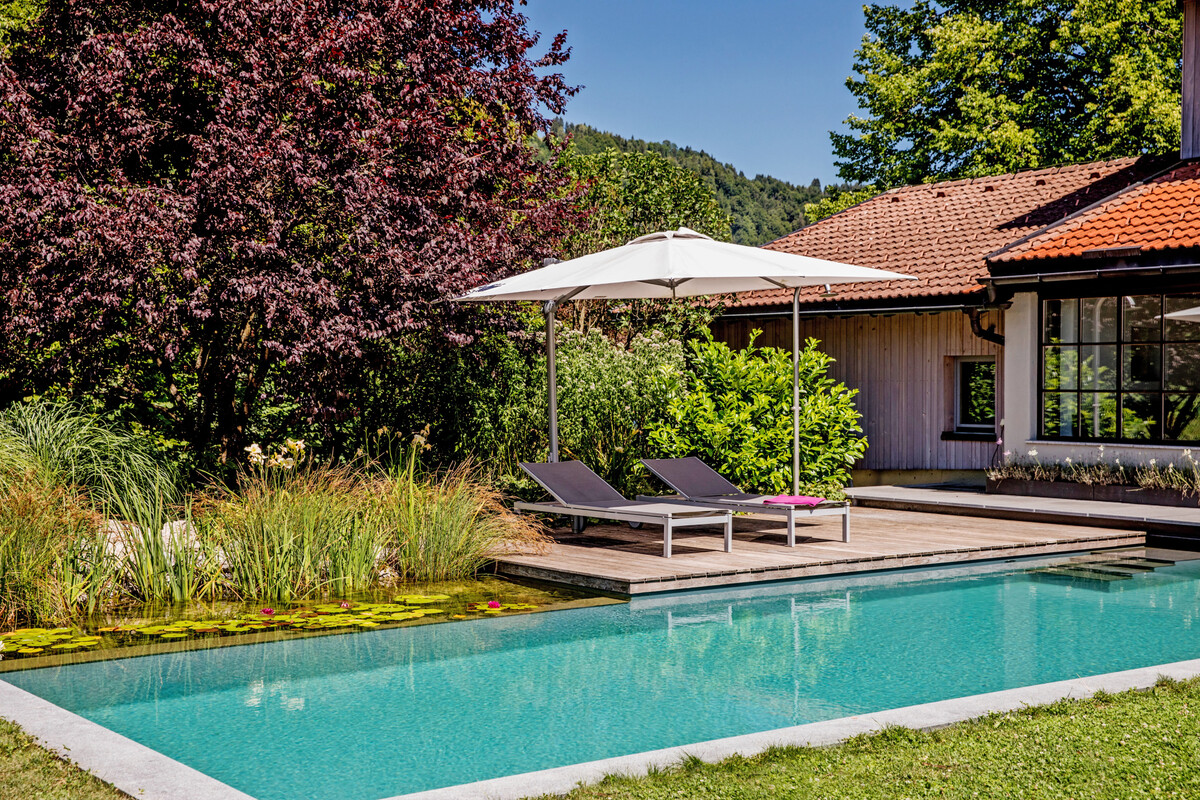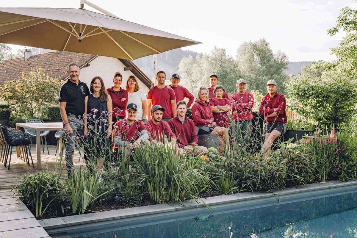 Apropos Gärtner von Eden – seit 2004 ist Hübner dabei. Anfangs haben sie ihn auf der Messe belächelt, als er sich als Drei-Mann-Betrieb für eine Mitgliedschaft interessierte. Bei einem Gesprächstermin auf der GaLaBau hat man ihm noch prophezeit, dass er werde wachsen müssen, um die Kriterien zu erfüllen. Doch kurz darauf war es dann soweit. „Die Entscheidung, zu den Gärtnern von Eden zu gehen, habe ich nie bereut“, sagt Hübner heute. „Es ist zwar relativ kostenintensiv, aber es ist für mich gerade wegen der ERFA-Treffen und dieses Begegnens auf Augenhöhe so wertvoll.“ Dabei sind die Gärtner von Eden jetzt zu zweit in der Region, denn in Heimenkirch, kaum 15 km entfernt, sitzt Herrhammer Gärtner von Eden (siehe DEGA GALABAU 7/2017). Geht das eigentlich mit zwei GvE-Betrieben? „Ich glaube, in den 22 Jahren gab es zwei Kunden, bei denen wir beide im Gespräch waren“, schaut Hübner zurück. Es gebe halt „Hübner-Kunden“, oder „Herrhammer-Kunden“ schmunzelt der Wahl-Allgäuer. Sobald ein anderer GvE-Betrieb im Spiel sei, mache er eh kein Angebot, versichert der Unternehmer. Wenn es um Pools geht, kommt auch der Zusammenschluss der Genossenschaft zum Tragen. Hier arbeitet das Allgäuer Unternehmen mit den Kollegen von Schleitzer Gärtner von Eden aus München eng zusammen, die Biotop-Partner sind. Der einheitliche Markenauftritt hinterlässt nach Außen ein stimmiges Gesamtbild. So können sich die Genossenschaftsmitglieder stärkenorientiert unterstützen. Ein weiterer unkomplizierter Mehrwert ist der Azubi-Tausch und die GvE-Akademie. Dies wird für die rund 1.400 GvE-Mitarbeitenden über eine eigens entwickelte App koordiniert.