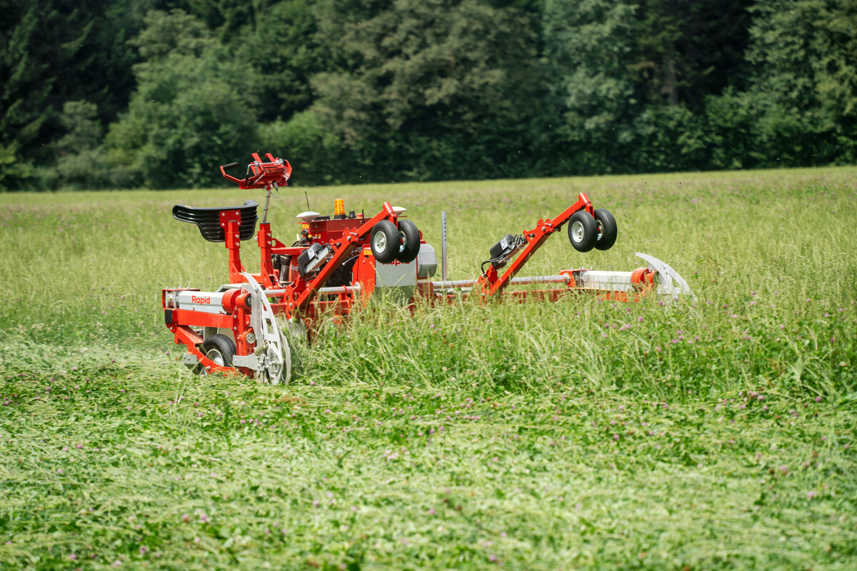 Aber vielleicht klappt das Mähen und Abräumen von Hochgras in Zukunft sogar völlig ohne menschliches Eingreifen: Schon im vergangenen Jahr hat Rapid Technic seinen satellitengeführten Geräteträger Cosmos 300 in umfangreichen Endanwender-Tests bei Landwirten in der Futtergewinnung erprobt. Die Maschine ist mit einem Doppelmesser-Mähwerk und einer Möglichkeit zum Kreiseln ausgestattet. Die dazu passende Cosmos-App fürs Smartphone bietet Endanwendern die Möglichkeit für Bahnplanung, Fahrschema, Statusmeldungen und Diagnose. Bisher arbeitet die Maschine noch teilautonom und wird unter anderem vom Landwirt per Drohne überwacht.
