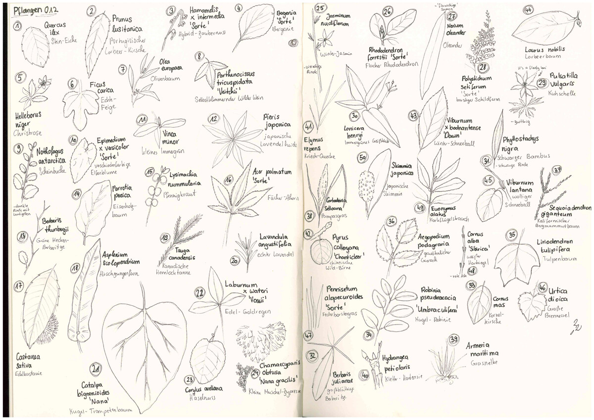 Pflanzenlernen ist für Auszubildende besonders schwierig. Lydia Weber aus Viersen-Süchteln behilft sich mit dem Zeichenstift. Die Auszubildende bei Frissen & Zohren in Niederkrüchten zeichnet die Pflanzen, die sie sieht und kann sie sich dadurch besser einprägen. Ihren Aufenthalt im Gartenbauzentrum Wolbeck, wo die Pflanzen beschildert sind, hat sie gut genutzt. Am Ende ergibt das Ganze auch eine tolle Erinnerung an die Zeit der Ausbildung.