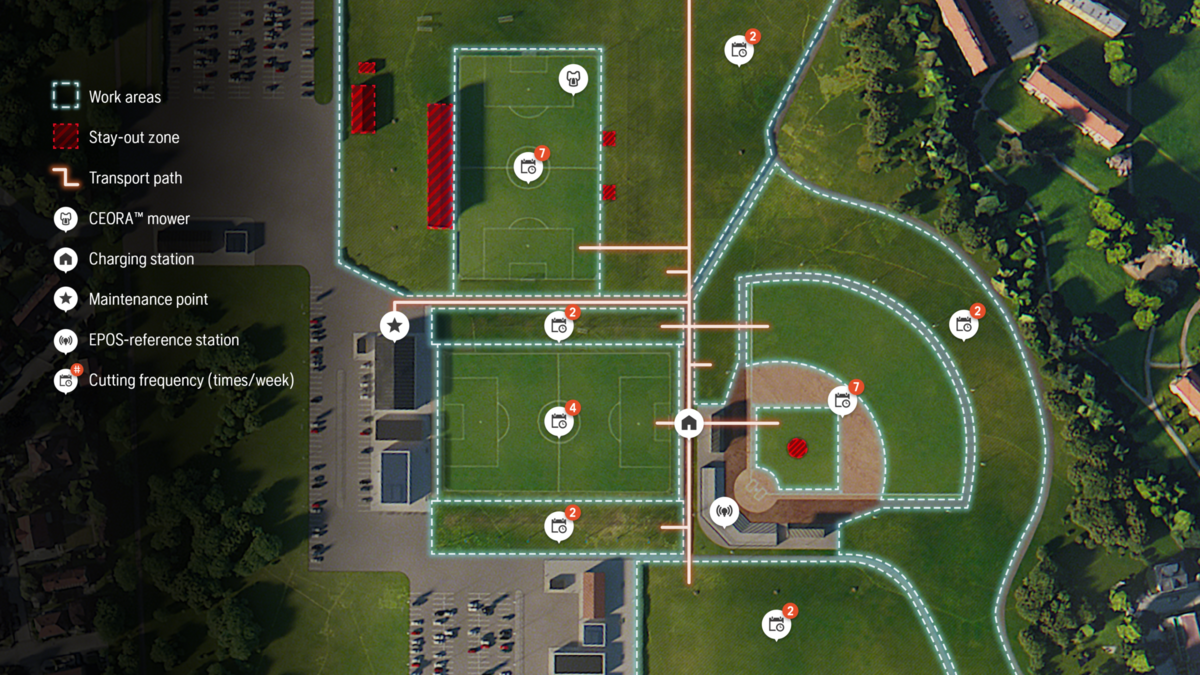 Die Husqvarna-Fachhändler helfen ihren Kunden dabei, entsprechende Karten und Mähzeitenpläne zu erstellen. Seit Mitte 2023 gibt es zusätzlich Repeater zur Verstärkung der Radiosignale auf weitflächigen Golfplätzen. Fährt ein Mähroboter in einen Funkschatten, kann er über die Berechnung der Raddrehzahl sowie mit Ultraschall- und Stoßsensoren weiternavigieren. Eine weitere Möglichkeit eröffnet Husqvarna mit seiner Hybridtechnik – die betreffenden Modelle arbeiten überall dort, wo Satellitenempfang besteht, mit GNSS-Signalen, und wo keine zu empfangen sind, können sie von einem unterirdischen Signalkabel geführt werden.