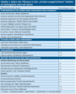 Neben den Modellversuchen der LWG konnten in einem realen Pilotprojekt in einem Neubaugebiet der Gemeinde Willanzheim im Steigerwald weitere Pflanzenarten getestet werden. Dort wurden 2007 Versickerungseinrichtungen in Form von bepflanzten Mulden mit nachgeordneten Überlaufbecken errichtet mit dem Ziel, kein Niederschlagswasser aus dem bebauten Gebiet zusätzlich in die Vorflut abzuleiten. Hierfür wurden zwei Pflanzenkombinationen zusammengestellt. Von vier Mulden wurden je zwei mit einer Artenauswahl für eher trockene Verhältnisse bestückt und zwei mit Arten, die eher einen frischen Standort bevorzugen. Zur Pflanzvorbereitung wurde im versickerungsaktiven Bereich auf Miete gelagerter Oberboden aus der ehemals landwirtschaftlichen Fläche 20 cm dick aufgetragen. Die Tabellen 1 und 2 geben einen Überblick über die verwendeten Arten und deren Entwicklung nach elf Jahren.