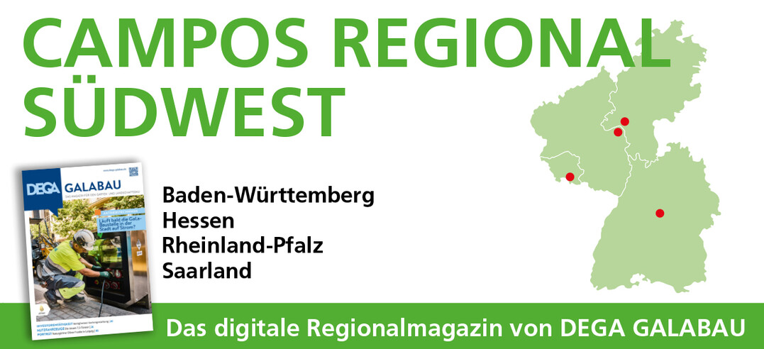 "campos regional südwest" umfasst die drei Bundesländer Baden-Württemberg, Hessen, Rheinland-Pfalz und Saarland, deren jeweils dort angesiedelten GaLaBau-Betriebe in drei Landesverbänden organisiert sind: dem VGL Baden-Württemberg, dem FGL Hessen-Thüringen und dem VGL Rheinland-Pfalz und Saarland.