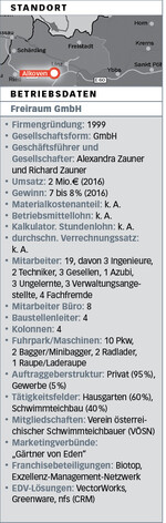 Außerdem haben die Unternehmer am Image gefeilt. „freiraum haftete lange Zeit dieses etwas Abgehobene an. Davon wollten wir bewusst wegkommen", erklärt Alexandra Zauner „Weil es ja auch nicht so ist. Wir bauen auch kleine Vorgärten mit Liebe zum Detail", fährt die Unternehmerin fort. War jeder Garten früher außerdem ein Unikat, sind heute viele Standards dabei, ganz besonders beim Bau von Badeanlagen. Die künstlerische Freiheit hat das Unternehmen nämlich auch einiges an Wertschöpfung gekostet; ganz besonders bei den Teichen, wo die Zauners mit mehreren Systemen experimentiert und eine Menge Lehrgeld bezahlt haben. Seit drei Jahren ist freiraum Biotop-Partner und bekommt einen großen Teil der Anfragen in Österreich – obwohl 80 bis 85 % der gebauten Anlagen trotzdem selbst akquiriert sind. Die „Livingpools" haben sich zu einem angenehmen – weil standardisierten – Umsatzbestandteil entwickelt.