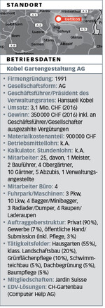 Hansueli Kobel startete seine unternehmerische Karriere vor über 25 Jahren mit einem bescheidenen Startkapital. Er bot in den benachbarten Zürichsee-Gemeinden Herrliberg und Meilen einen Häckselservice an. Damals beschäftigte er zwei Aushilfsgärtner. Außenseiter, die der gelernte Zierpflanzengärtner aus seiner Zeit in der Jugendarbeit in der Drogenszene am Zürcher Platzspitz kannte. Die Anstellung eines gelernten Gärtners, ein Jahr nach der Firmengründung, sei der schwierigste Entscheid in der Firmengeschichte gewesen, stellt der GaLaBau-Unternehmer rückblickend fest. Jahr für Jahr wurde ein weiterer Gärtner beziehungsweise eine weitere Gärtnerin angestellt und seit 1996 werden auch Lernende ausgebildet. „Von eins auf 25 in 25 Jahren", wird denn auch das eingeschlagene Tempo der Firmenentwicklung in der Spezialausgabe der jährlich erscheinenden Kundenzeitschrift „Grünschnabel" beschrieben. Mit dem kontinuierlichen Wachstum einher ging die Spezialisierung auf Trockenmauerbau und Natursteinbearbeitung. Der Firmeninhaber bildete sich im Bereich Gartengestaltung und Pflanzenverwendung weiter und belegte den von Fritz Wassmann ins Leben gerufenen Kurs „Gestalten mit Pflanzen". Der Kurs habe seine Begeisterung für Pflanzen als wesentlichen Bestandteil schöner Gärten geweckt, so Kobel. Nach und nach verstärkte sich die Fokussierung auf Gartengestaltung in seinem Betrieb. „Schöne Gärten, einmalig und persönlich, mit viel Respekt vor der Natur", lautet das Credo der Firma. Mit dem Geschäftsführer sind derzeit drei Personen in der Gartenplanung tätig. Ein vierter Planer, ursprünglich Möbeldesigner, hat im März begonnen und wird sein Know-how im Bereich moderner Visualisierungstechnik einbringen. Planungsabteilung und Administration sind in die großzügigen Büroräume im neuen Werkhofgebäude in Bubikon eingezogen.