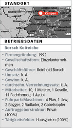 Gebaut wird schlüsselfertig und mit fünf Jahren Garantie auf jeden Baum. „Der Kunde kriegt den Garten mit dem letzten Lämpchen. Ich will auch keinen anderen Handwerker haben", erklärt der Unternehmer. „Ich brauche deshalb unheimlich viele verschiedene Leute, weil das so viele Gewerke sind." Das, was die eigenen Leute nicht können, liefern Firmen zu, mit denen Borsch eng zusammenarbeitet. Aber immer im Namen des Generalunternehmers. Nur bei den Kois vermittelt er an zwei vertrauensvolle Lieferanten.