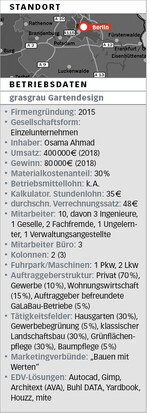Zum Erfolg trägt auch bei, dass die Struktur von grasgrau extrem schlank ist. „Wir haben alles, was wir an Haben-Kosten rauswerfen konnten, rausgeworfen", sagt der Unternehmer. Ich brauche keinen Radlader oder Minibagger für mein Selbstwertgefühl. Das kann ich alles mieten." Natürlich ist das auch der Pflege als Leistungsschwerpunkt und der Lage in der Innenstadt geschuldet, die Glück und Last zugleich ist. Denn die Wege zum Kunden sind zwar kurz, dafür ist Büroraum teuer und es fehlt an Lagerplatz und Stellfläche. Ahmad kompensiert das mit einem Netzwerk aus befreundeten Betrieben und Dienstleistern. Braucht es Maschinen oder Spezialleistungen, kommen die von einer Verleihfirma oder einem Firmenpartner. Für Grünschnitt wird ein 10-m³-Container gestellt und die Baustoffe oder Pflanzen bringen Zulieferfirmen. Fehlt mal ein Sack Zement, holt ihn der Chef beim Bauhaus-Drive-in und nutzt dafür einen alten Pkw, dem Beulen und Kratzer des Berliner Stadtverkehrs nichts mehr anhaben können. Außerdem gehören die Erhaltung des Bestandes und das Wiederverwenden von alten Materialien zur Philosophie. „Wir können nicht wie ein klassischer Betrieb arbeiten. Letztlich sind wir darauf angewiesen, dass wir Zulieferer haben und zusehen, dass wir flexibel bleiben", erklärt der Unternehmer.