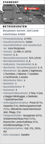 Borgmann scheut sich auch nicht davor, mehr zu verkaufen, als die eigene Mannschaft als Leistung erbringen kann. Ebenfalls von Beginn an verfolgt der Unternehmer eine Art Generalunternehmer-Konzept: Er verkauft große, gut ausgestattete Anlagen, um dann viele Leistungen an Partner zu vergeben, mit denen er teilweise schon sehr lange zusammenarbeitet. „Das war schon immer so, dass ich mir relativ viel Man-power reingeholt habe", sagt er. „Wir nehmen uns zum Beispiel grundsätzlich jemanden für Elektroarbeiten, Schlosserleistungen, Abdichtungen, Holzarbeiten, das Pflastern und das Mauern", sagt der Norddeutsche. Und das sehr konsequent: „Wenn es irgendwas zu machen gibt, dann rufe ich oder ein Mitarbeiter einen festen Partner an – und wenn es nur für 10 m² sind", erklärt er. „Weil ich sage ‚entweder alles oder gar nichts’." Der eigene Betrieb macht die Kernbereiche: alle Leistungen, die mit Pflanze und Vegetation zu tun haben, sowie alle vorbereitenden Arbeiten und die Vorbereitungen für das Pflastern. Nach außen sehe es aus, als wären alle Leistungen vom GaLaBau-Betrieb. Schließlich sind die Borgmann-Mitarbeiter zur gleichen Zeit auch auf der Baustelle. Der Qualität tut das gut, dass sich Spezialisten um die einzelnen Gewerke kümmern, der Wertschöpfung auch.
