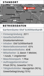 „Ich bekomme durch die Präsenz hier sehr viel Resonanz aus dem Oldenburger Raum", meint Schlittenhardt, der die eher ländlichen Gärten außerhalb Bremens schon deshalb schätzt, weil sie einfacher zu beliefern und abzuwickeln sind. In Bremen sind viele Baustellen nur durch die Wohnung oder den Keller zu erreichen, mit erheblichem Körpereinsatz. Und fahrtechnisch sei es auch kein Problem. „Ich bin manchmal schneller in Oldenburg, als wenn ich im Stadtgebiet unterwegs bin.