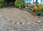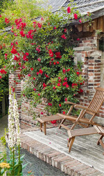 Das Recycling gehört natürlich nicht nur bei Naturstein zum Programm. Einen Beitrag über das Integrieren historischer Materialien in die Gestaltung ist ja bereits in DEGA erschienen ( dega5628 ). Darin zeigt Frank die Ausstrahlung von Materialkombinationen aus neuen und historischen Baustoffen; alten Klinkern, Natursteinbauteilen, Metallelementen und Holzbalken. Auch im Ommertalhof ist viel davon zu sehen. „Wir haben mal bei ebay 3 t belgische Klinker für 50 Euro geschossen. Das war unser bestes Schnäppchen", erzählt Frank schmunzelnd. Aus den Schieferschindeln eines Kirchendachs hat der Rheinländer eine sehenswerte Trockenmauer gebaut. Eine ganze Remise haben Nicole und Frank bei einem Kunden aus Abrissmaterial errichtet.