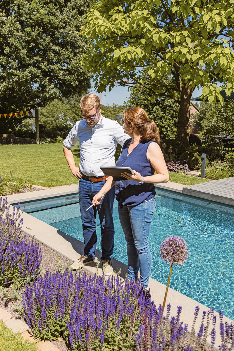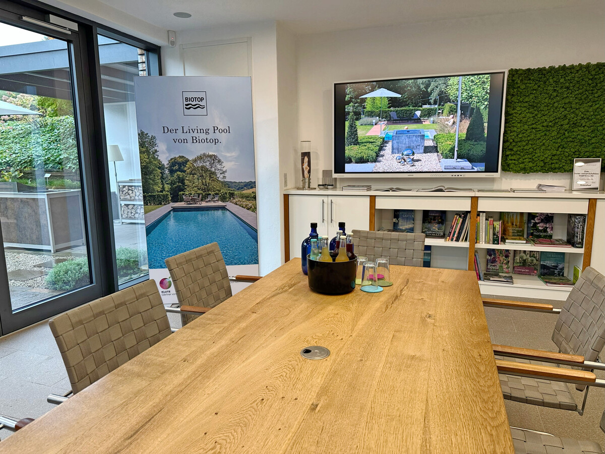 3Von Klute gebaute Privatgärten reichen bislang bis zu einem Volumen von 1,5 Mio. Euro. Dass solche Projekte einen belastbaren Plan voraussetzen, versteht sich von selbst. Doch auch Kundinnen und Kunden mit kleineren Vorhaben haben inzwischen erkannt, welchen Mehrwert eine gute Planung bietet. Dass inzwischen Planer und Bauleiter eng zusammenarbeiten, sorgt in allen Projekten für mehr Klarheit, realistischere Angebote und letztlich für echte Kundenbegeisterung. Gerade bei materialintensiven Gewerken wie dem Pool- und Schwimmteichbau zeigt sich dieser Schulterschluss besonders deutlich. Auch die Partnerschaft mit Biotop erweist sich dabei als wichtiger Hebel. Der Bau von Pools ist besonders materialintensiv und macht rund zehn Prozent des Jahresumsatzes aus. „Mit acht bis neun Anlagen pro Jahr bewegen wir uns auf einem konstanten Niveau.“ In diesem Jahr kam erstmals ein Schwimmteich für ein Hotel im Wintersportort Schmallenberg hinzu – und die Klutes waren froh, dass sich Partner Biotop bereits mit den besonderen Anforderungen gewerblicher Anlagen auseinandergesetzt hatte. „Das schönste Material sind aber natürlich die Pflanzen“, meint Klute. „Wir möchten künftig noch stärker mit Pflanzen arbeiten, denn da zeigt sich echte gärtnerische Kompetenz.“ Der Verkauf von Großgehölzen sei im waldreichen Sauerland allerdings deutlich anspruchsvoller als in urbanen Regionen. Für Beet-/Staudenplanungen vertraut das Unternehmen auf einen Pflanzplaner, den Klute im Studium kennenlernte.