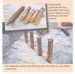 Dieser Keil muss dann genau in der Flucht des Schrots stehen. Dieser Arbeitsschritt wird so lange wiederholt, bis aus reichend Keile entlang des Schrots gesetzt sind. Wenn der Stein sehr stark ist oder gegen das Lager gestoßen wird, empfiehlt es sich ebenfalls, auch auf weiteren Seiten des Steins Keile zu setzen. Wenn alle Keile stecken, ohne allzu leicht wieder herauszufallen, ist der Stein bereit. Dann atmet der Metz durch, kontrolliert die Flucht seiner Keile ein letztes Mal, holt den mittelschweren Fäustel und treibt die Keile Stück für Stück und vor allem gleichmäßig in den Stein, bis dieser bricht.