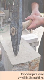 Oder einfach ausgedrückt: Wenn viel Material weggenommen werden muss, ohne allzu präzise sein zu müssen. Dann holt der Steinhauer tief Luft, nimmt den Zweispitz in seine Hände und drischt im besten Fall von oben auf den Stein.