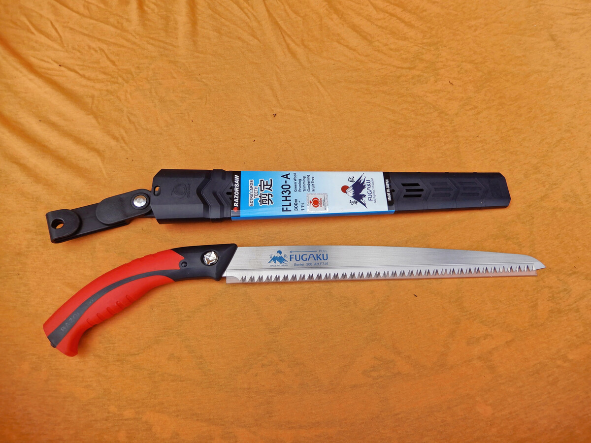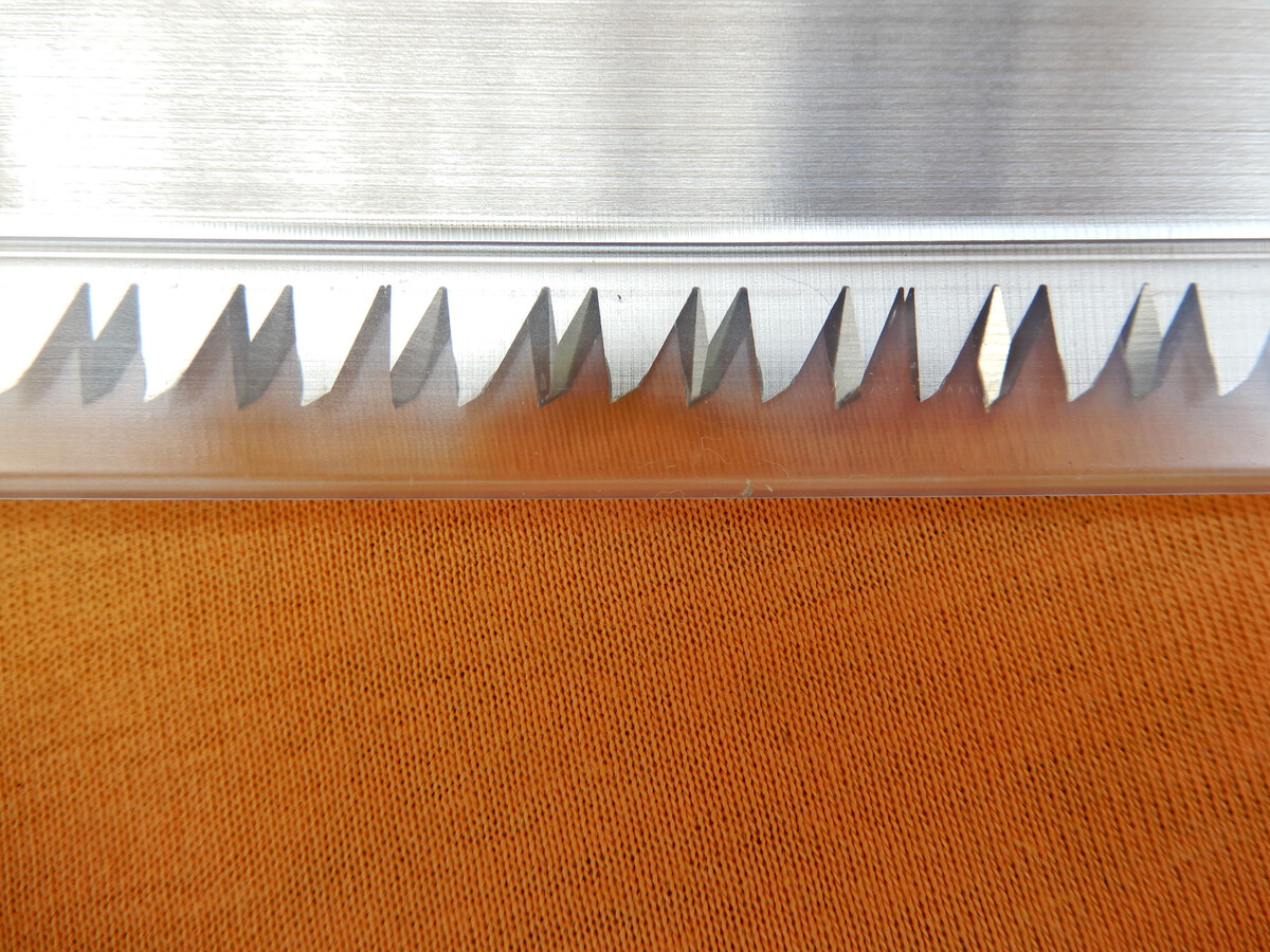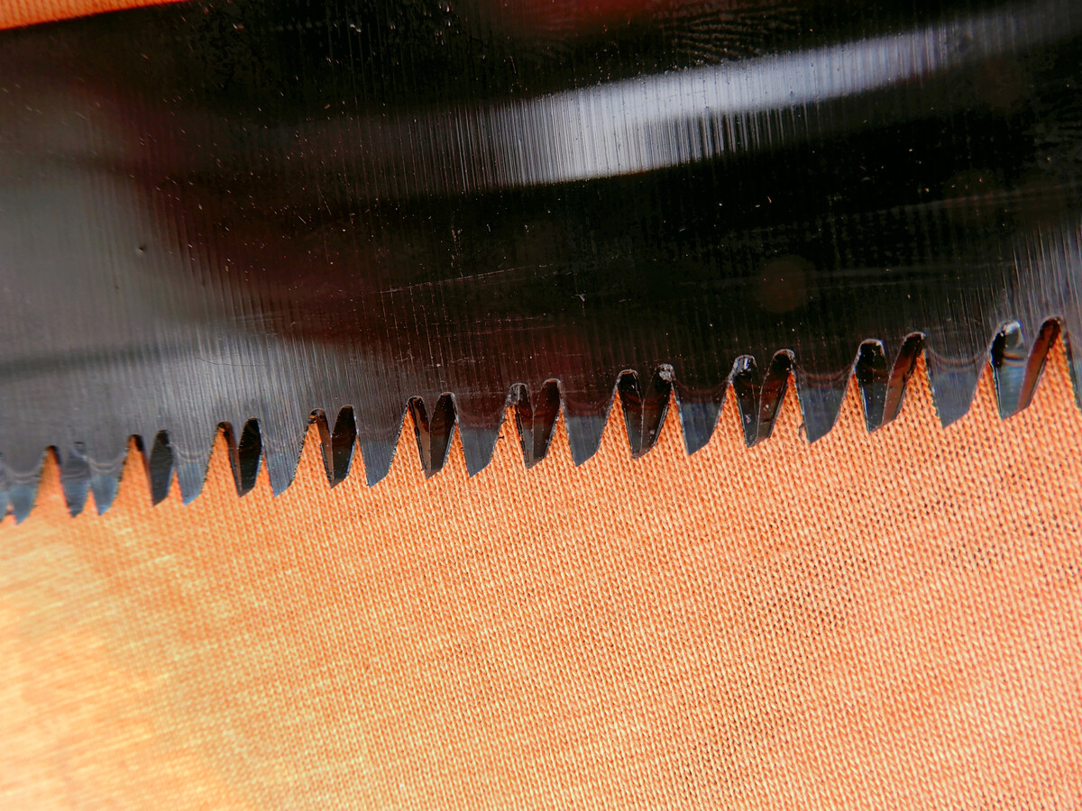 Das Sägeblatt aus Stahl mit hohem Kohlenstoffgehalt, Hartchrombeschichtung und lasergeschnittener Zahnform muss einen schmalen Rücken (circa 0.9 bis 1,3 mm) und einen breiteren Zahnschrankbreitenbereich (circa 15 bis 20 % größer als die Blattstärke) besitzen, um leicht und ohne zu Verklemmen durch den Sägespalt zu gleiten. Dabei hat sich überall die japanische Zahn- und Schneidengeometrie mit drei Schneidflächen durchgesetzt, die auf Zug aggressiv ins Holz gehen, auf Druck die noch vorhandenen Holzfasern und Späne nochmals zerteilen und aus dem Sägespalt räumen. Sind wie bei der Samurai GKC-300-LH auch noch Räumtaschen und Räumzähne integriert, funktioniert das noch besser, verringert aber die Schnittleistung durch die geringere Anzahl von Sägezähnen. Die Sägeblattrückenhöhe variiert je nach Sägeblattlänge zwischen 35 bis 50 mm.