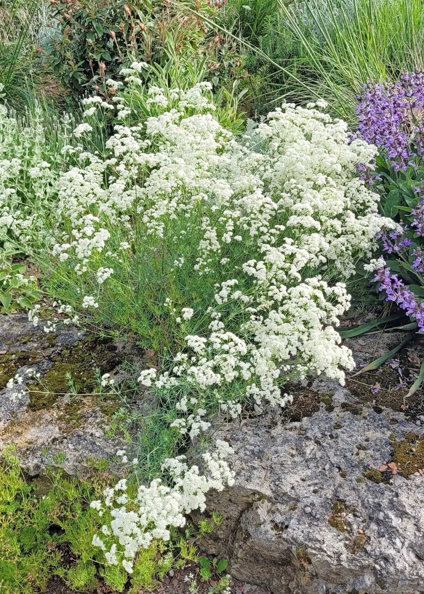 von Jonas Reif, Zeuthen erschienen am 15.04.2026Die Gattung Galium (Labkräuter) ist den meisten nur in Form des Waldmeisters (G. odorata) vertraut, Naturgartenfans kennen und schätzen sicherlich auch das Echte Labkraut (G. verum). Das ebenfalls in Europa vorkommende Blaugrüne Labkraut (G. glaucum) dürfte indes weit weniger bekannt sein. In Deutschland kommt die wintergrüne Art nur in wenigen Regionen (zum Beispiel am Kaiserstuhl, auf der Schwäbische Alb, in der Oberpfalz oder im Harz) vor und besiedelt hier trockene Kalkmagerrasen, Kalkfelsen und lichte Gebüsche. Die Blütezeit liegt meist in der zweiten Mai- und ersten Juni-Hälfte. Jedes Mal bin ich erstaunt, welche Blütenpracht sich dann aus einen zuvor recht klein erscheinenden Pflänzchen entwickelt. Anschließend legt sich das zuvor Aufgetürmte flach auf den Boden – sowohl aus gestalterischer als auch Pflege-Sicht sehr praktisch. Im Gegensatz zu den vorgenannten Labkräuter ist die Ausbreitung durch Ausläufer – wenn überhaupt - nur minimal. Besonders geeignet erscheint mir die Art zwischen Lavendel, der erst ab Ende Juni zu Hochform aufläuft und ähnliche Bedingungen schätzt – also vollsonnig-warme Standorte mit kalkreichen, gerne auch steinigen Böden. PS: Die deutsche Bezeichnung „Blaugrünes Labkraut“ bezieht sich auf die kaum wahrnehmbare Blattrückseite. Viel stärker fällt die frischgrüne Oberseite auf, die Beete im Frühjahr zum Leben erweckt.