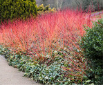 Ja, man könnte verzweifeln, wenn Pflanzennamen das Wichtigste im Leben wären. Das sind sie zum Glück nicht. Umso mehr sollte man sich einfach an dieser grandiosen Auslese des Blut-Hartriegels erfreuen, der im Winter gekonnt eingesetzt für ein wahres Rinden-Spektakel sorgt. Das gilt freilich nur, wenn der Strauch, der sonst sicherlich auch 3 bis 4 m erreichen kann, regelmäßig – also alle ein bis zwei Jahre - kräftig zurückgeschnitten wird. Besonders gut zur Geltung kommt das heimische, hitze- und trockenheitsverträgliche Gehölz in Gruppen gepflanzt vor wintergrünem Hintergrund. Um die ohnehin schon hohe Leuchtkraft zu steigern, sollten diese mit im Spätwinter blühenden Pflanzen wie Lenzrosen, grünblättrigen Seggen oder Efeu (wie im Bild)...