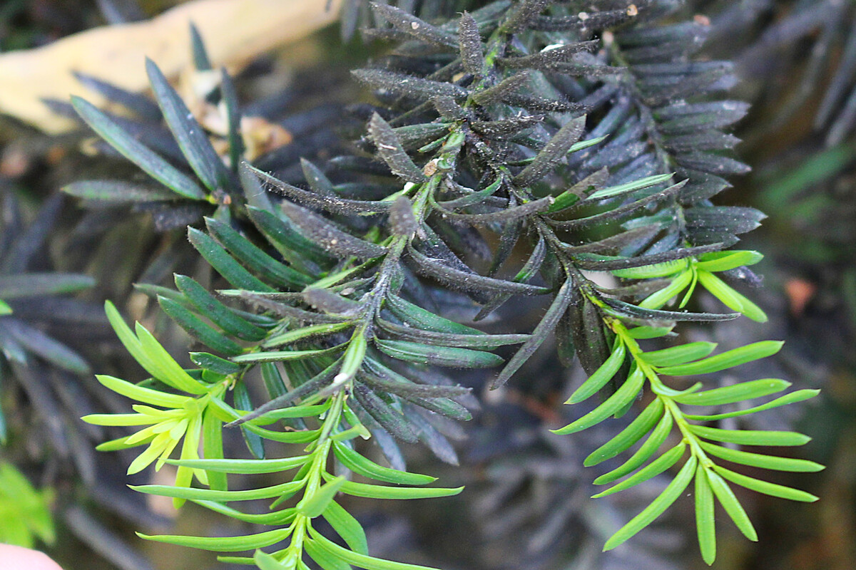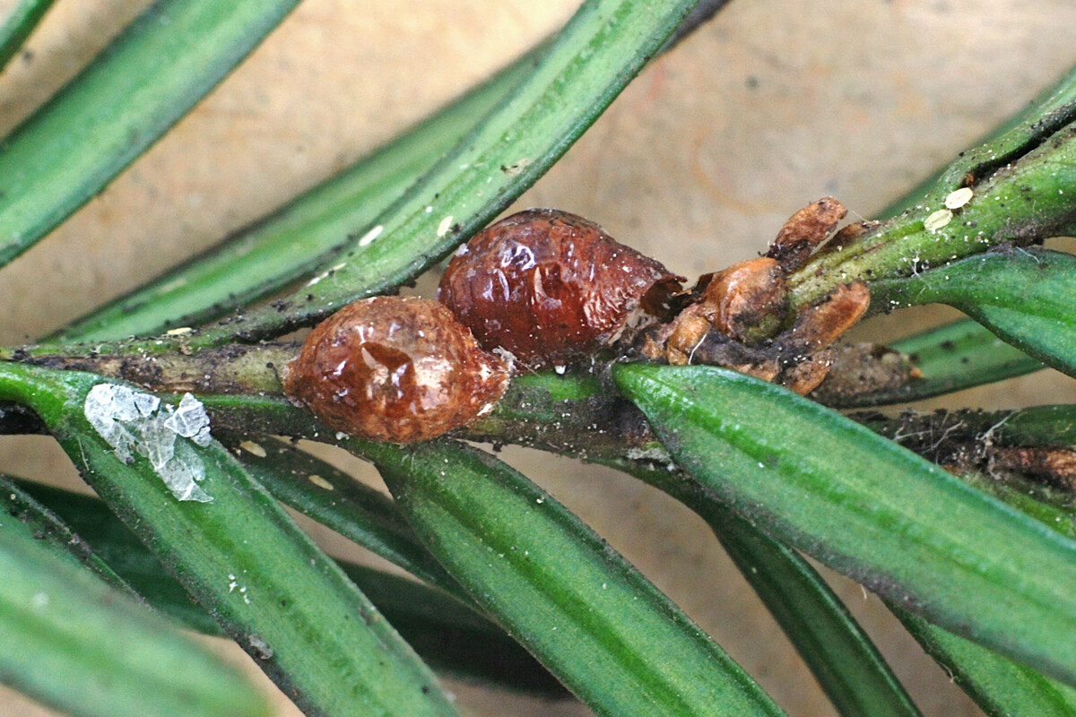 von Jochen Veser erschienen am 12.11.2025Die verschiedenen Entwicklungsstadien der Eibennapfschildlaus Parthenolecanium pomeranicum (früher Eulecanium crudum, E. taxi) sind aufgrund ihrer geringen Größe sehr unauffällig oder sitzen gut getarnt auf den Zweigen ihrer Wirtspflanze. Eine massive Besiedlung wird daher in der Regel nicht durch das zufällige Entdecken der Tiere auffällig, sondern die Population verrät sich durch ihre klebrigen Ausscheidungen. Diese zuckerhaltigen Säfte gelangen auf die Nadeln der Eiben, das Laub benachbarter Unterpflanzungen oder Plattenbeläge und Gartenmöbel im Umfeld der Eiben.