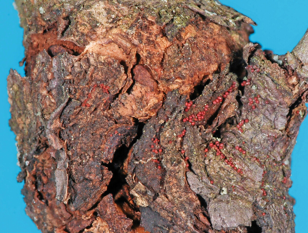 - Abgrenzung zu einigen anderen pilzlichen Erregern: Der Obstbaumkrebs (Neonectria ditissima) bildet sehr charakteristische offene Wunden, die der Baum durch die Bildung von konzentrischen Überwallungswülsten zu schließen versucht. Ein eindeutiges Merkmal ist die Bildung von leuchtend rot-braunen, kugeligen Fruchtkörpern (Perithecien; Einzelgröße zirka 0,3–0,5 mm) auf dem abgestorbenen Gewebe im Herbst (Abbildung); zusätzlich können bereits ab dem Frühjahr weiß gefärbte Sommersporenlager (Sporodochien; Einzelgröße 1–2 mm) nachgewiesen werden. Bei der Krötenhautkrankheit (Cytospora spp.), die auch unter dem Namen „Valsa“ bekannt ist, verfärbt sich die Rinde eher braun-violett als tiefschwarz. Namensgebend sind die aus der Rinde hervorbrechenden Fruchtkörper, die der Rinde eine raue, an Krötenhaut erinnernde Struktur verleihen. Im Vergleich zu Diplodia sind die Fruchtkörper (Pyknidien) nur etwa halb so groß (Einzelgröße zirka 0,1 bis 0,2 mm), zudem zahlreicher und stehen sehr dicht beieinander. Bei feuchter Witterung ist zudem oft der Austritt von rötlichen Sporenranken zu beobachten. Durchaus ähnlich wie die Krötenhautkrankheit im Erscheinungsbild und den gebildeten Fruchtkörpern zeigt sich die Infektion mit Phomopsis mali, dem Phomopsis-Triebsterben. Dieser Pilz lässt sich aufgrund seiner unterschiedlich gebildeten Konidien – elliptisch geformte a-Konidien und längliche, deutlich gekrümmte ß-Konidien – mit Hilfe eines Mikroskops leicht von den anderen pilzlichen Erregern unterscheiden.
