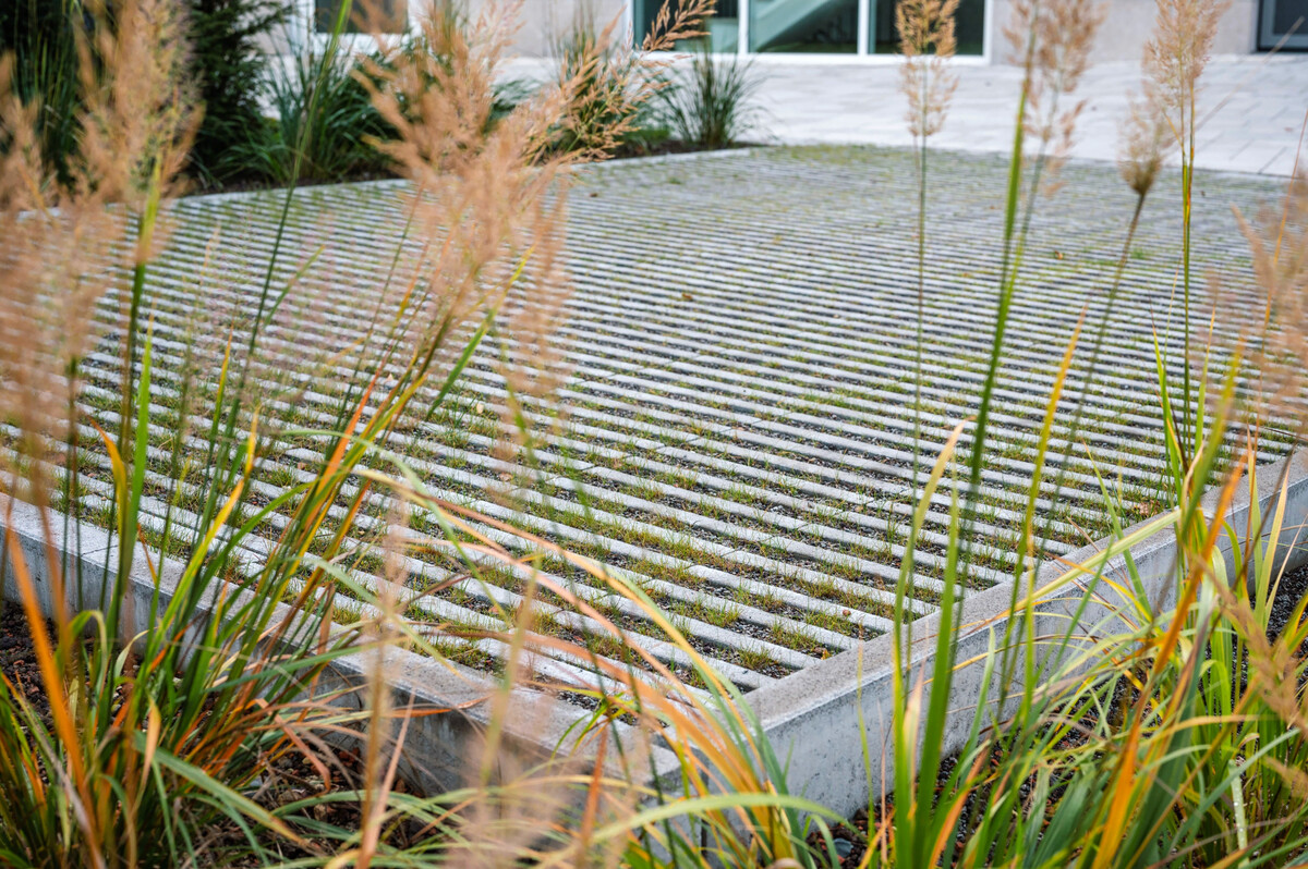 Der GDM.Scada liner ermöglicht grüne Kontraste zu moderner Gebäudearchitektur. Die Fugen können je nach Anforderung mit Rasen begrünt oder mit Basaltsplitt ausgeführt werden. Die Produktpalette der viereckigen Rasenfugensteine vervollständigt der GDM.Tetrago gap mit Abstandshaltern.