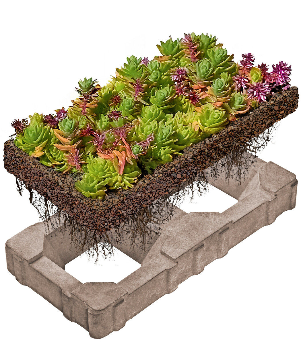 F. C. Nüdling: Die Greenstar-Rasenplatte von FCN mit ihren schmal wirkenden rechteckigen Steinformaten wurde vor allem für Flächen entwickelt, die vor sachlich-moderner Architektur bestehen müssen. Bei der 60 × 40 cm großen Rasenplatte sind drei 4 cm breite, parallele Fugen quer zur Verlegerichtung angeordnet und ergeben in der Fläche eine interessante Streifenoptik. Die Fugen lassen sich sowohl mit Basaltsplitt füllen als auch begrünen. Bei einer Plattendicke von 8 und 10 cm bieten die Fugen ausreichend Raum für Rasengittersubstrat.