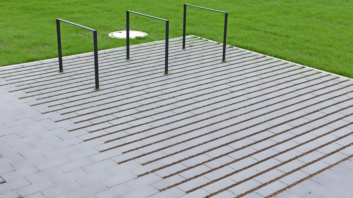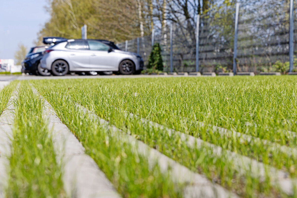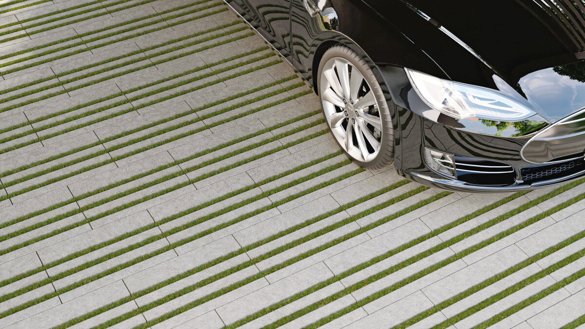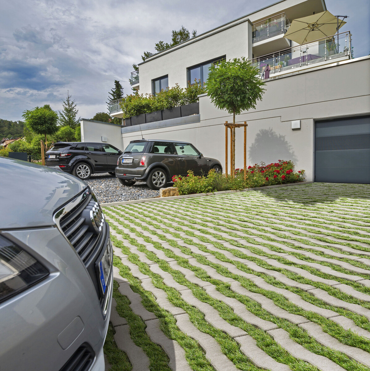 Metten Stein + Design: Der Greenline Pro-Rasenfugenstein im Standardformat 30 × 15 cm begrünt Parkplätze und Flächen. Seine schmalen, 4,5 cm breiten Steinstreifen ermöglichen eine gerade und filigrane Linienführung. Der begrünbare und versickerungsfähige Flächenanteil des Steins liegt bei rund 50 %. Eine spezielle Verzahnung sorgt für stabile Flächen.